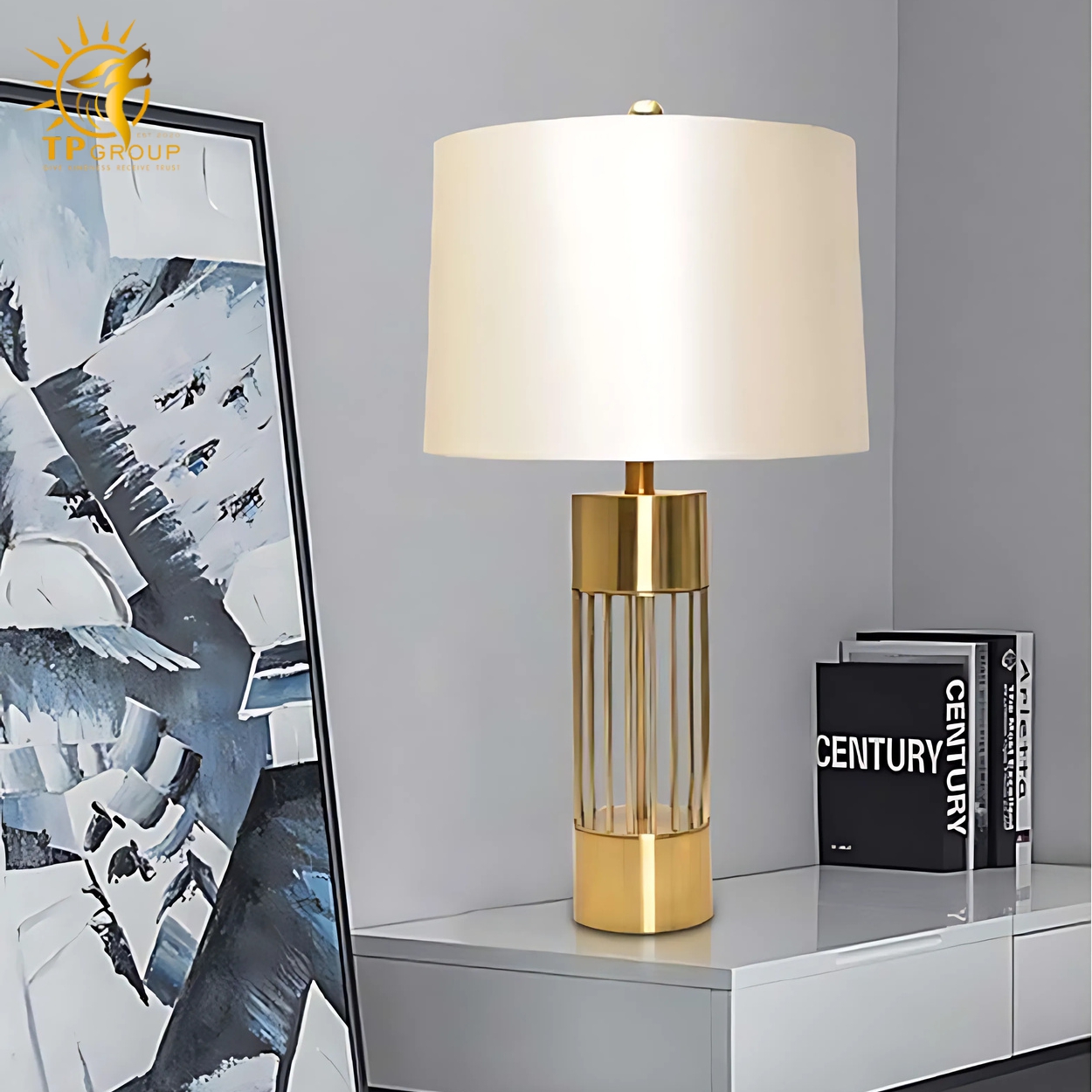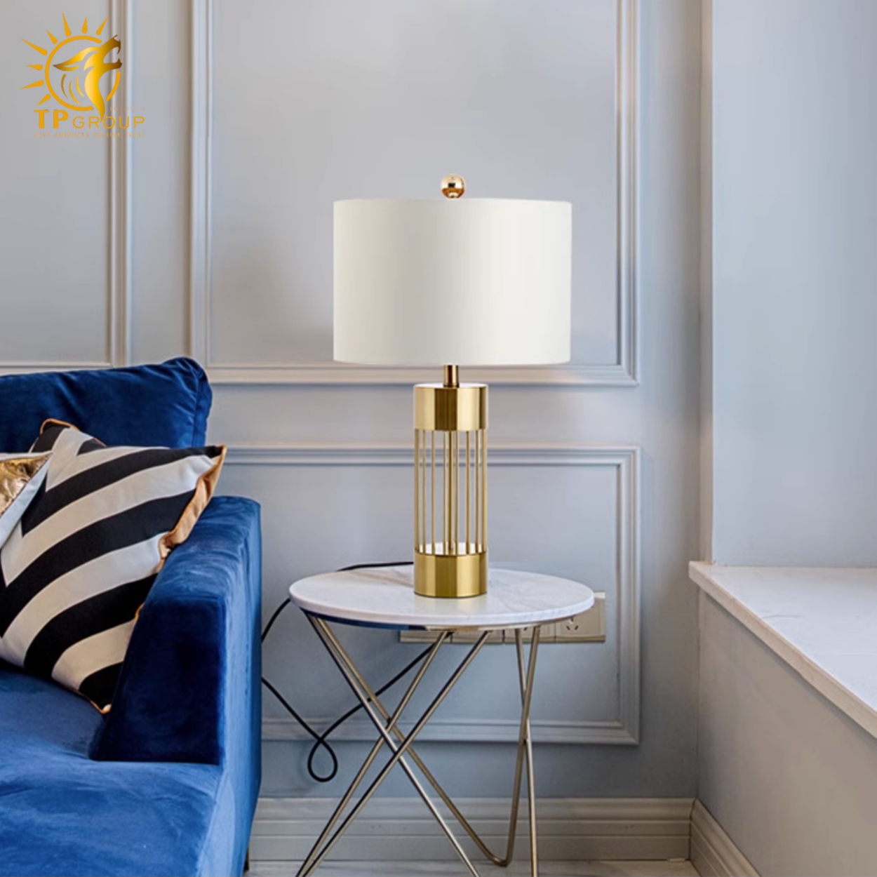 Đèn để bàn DB41 là sự kết hợp tinh tế giữa phom dáng hiện đại và chi tiết kim loại ánh vàng cổ điển. Phần chụp đèn tròn phủ vải trắng cao cấp mang lại ánh sáng dịu nhẹ, giúp không gian thêm phần ấm cúng và dễ chịu. Phần chân đèn nổi bật với thiết kế lồng thép mạ vàng sáng bóng, tạo điểm nhấn sang trọng đầy cuốn hút.