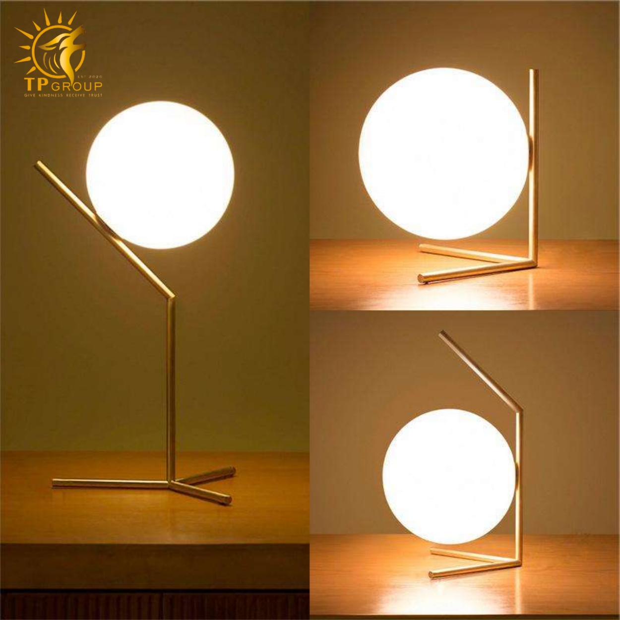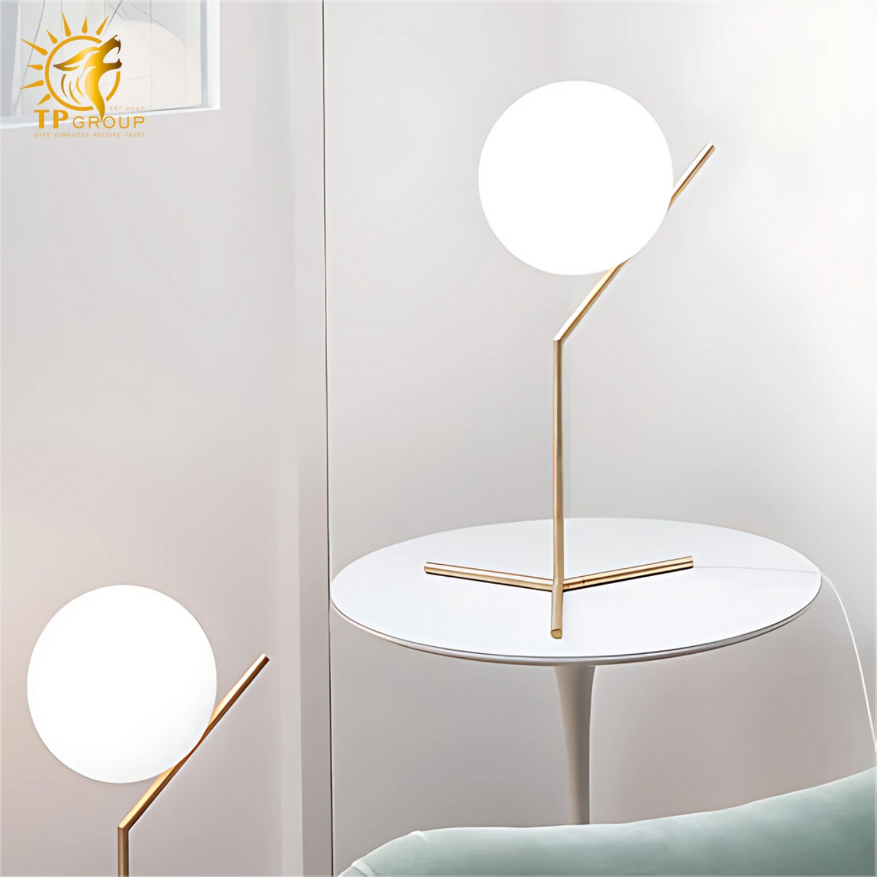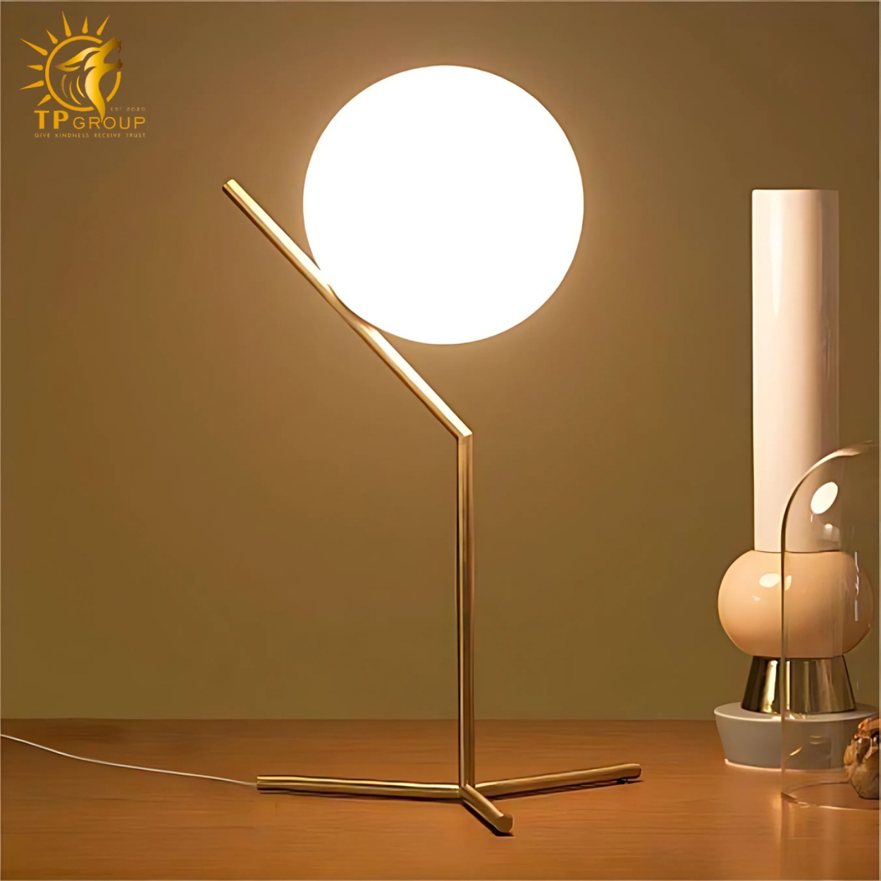 Đèn để bàn DBK02A nổi bật với kiểu dáng hình học lạ mắt và chao đèn thủy tinh hình cầu trắng tinh khôi, gợi liên tưởng đến mặt trăng dịu dàng. Khung đèn kim loại màu vàng đồng thiết kế theo đường nét gấp khúc tinh tế, vừa hiện đại vừa nghệ thuật – tạo nên một tổng thể nhỏ gọn nhưng vô cùng hút mắt.