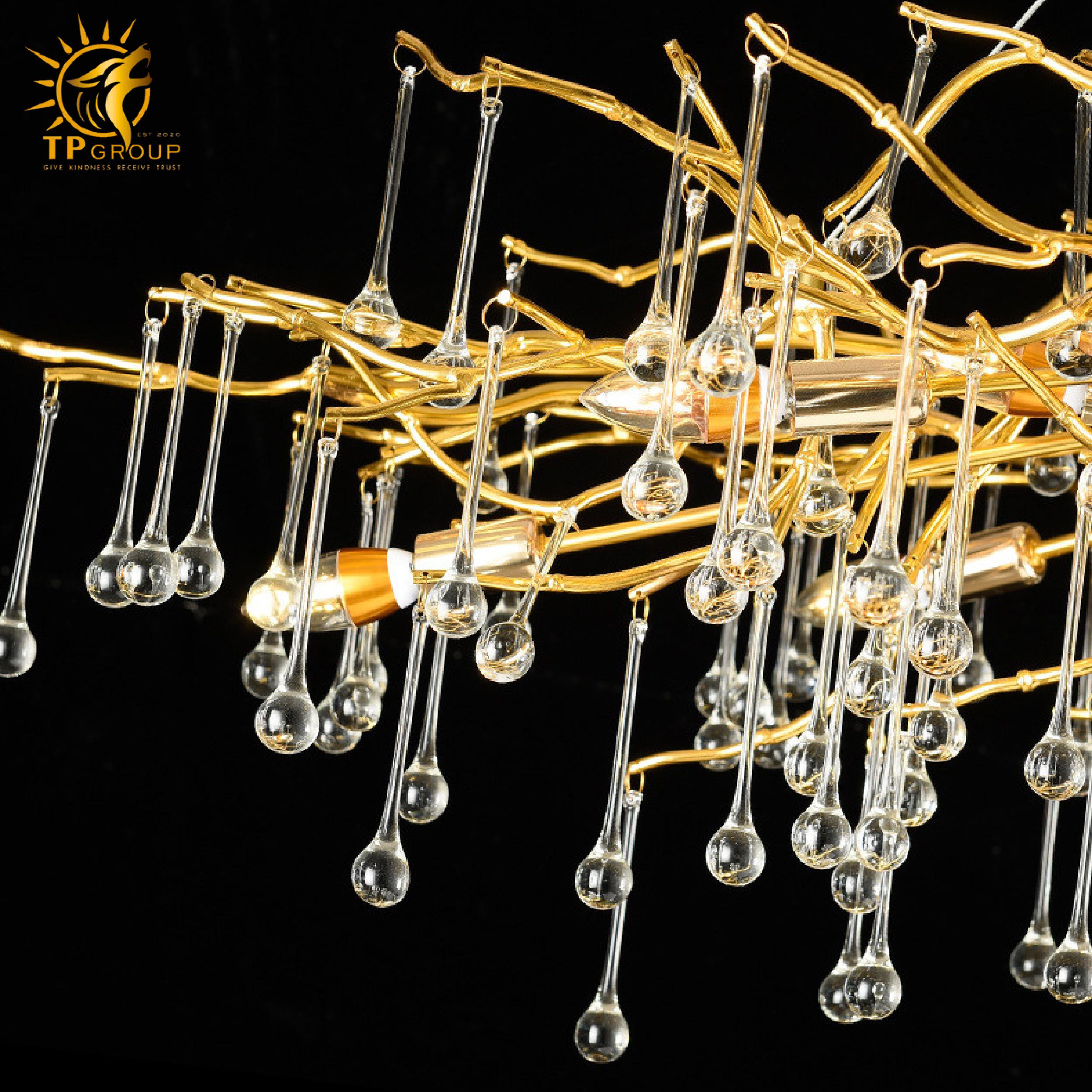 Lấy cảm hứng từ những rễ cây đan xen tự nhiên, đèn được tạo hình ấn tượng với khung kim loại sơn vàng nghệ thuật, kết hợp cùng hàng trăm hạt pha lê cao cấp lấp lánh như giọt sương sớm. Mỗi chi tiết đều được chế tác tinh xảo, thể hiện sự tỉ mỉ và đẳng cấp vượt trội.