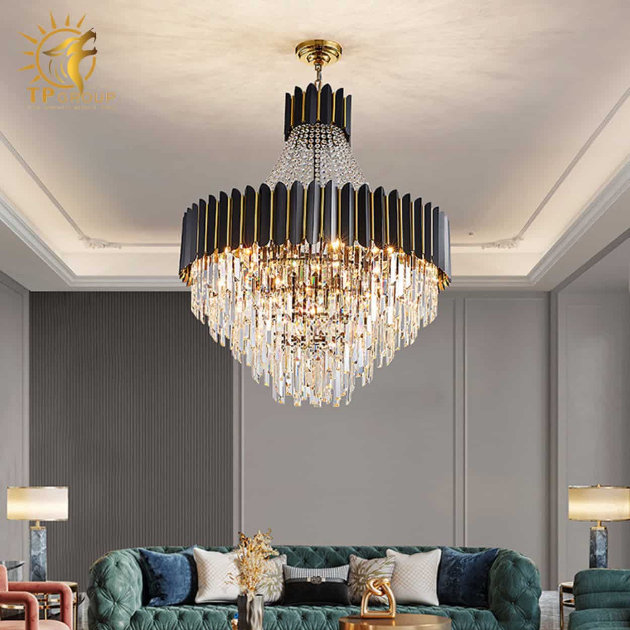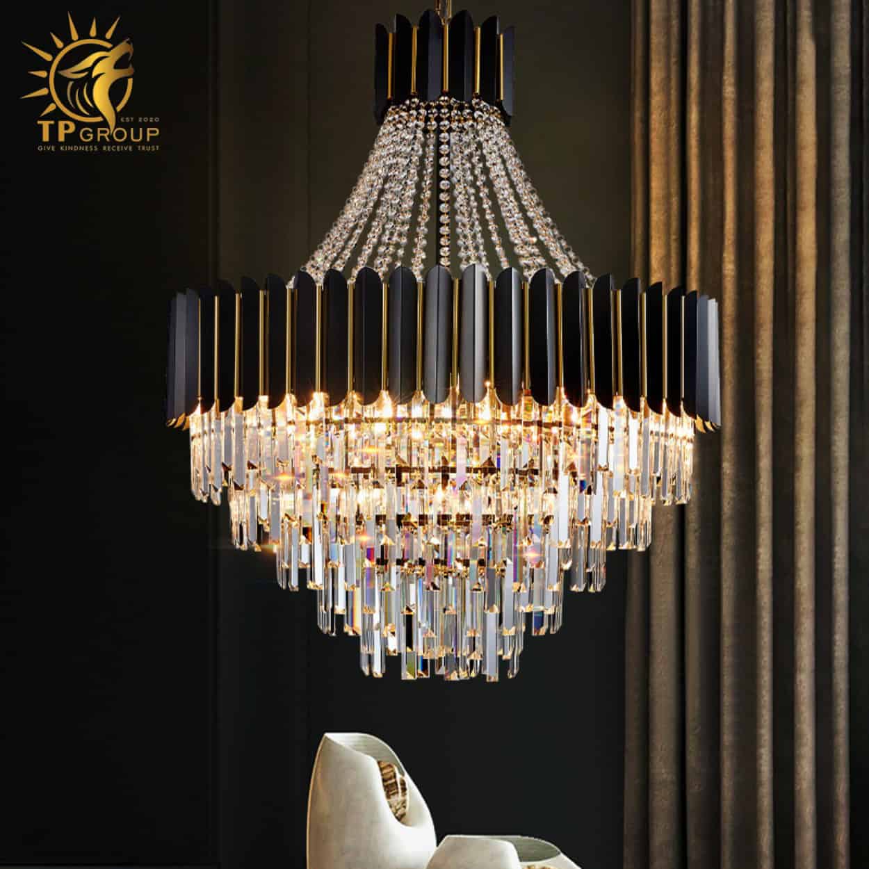 Kiểu dáng thả chùm nhiều tầng, kết hợp pha lê cao cấp trong suốt và kim loại mạ vàng sang chảnh.