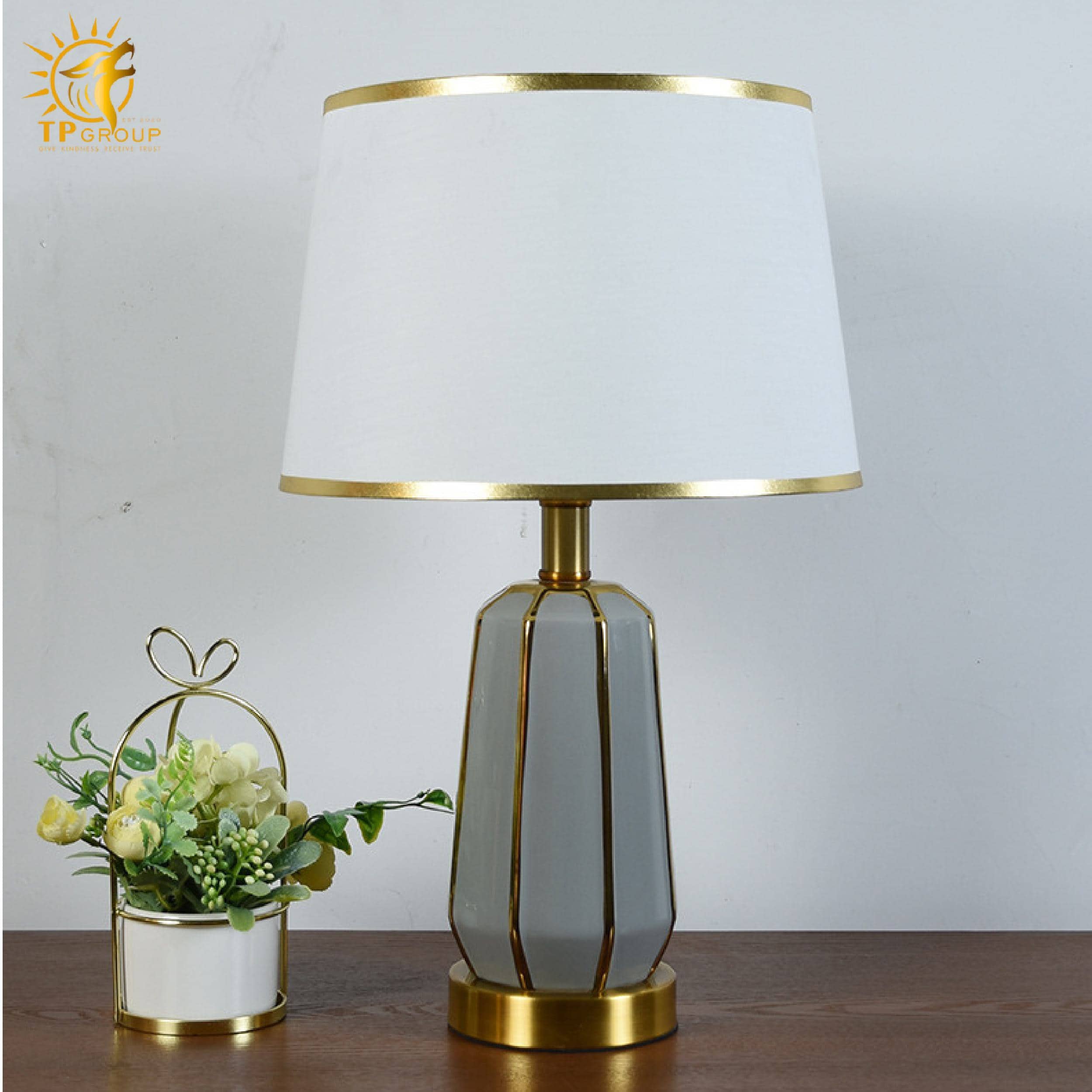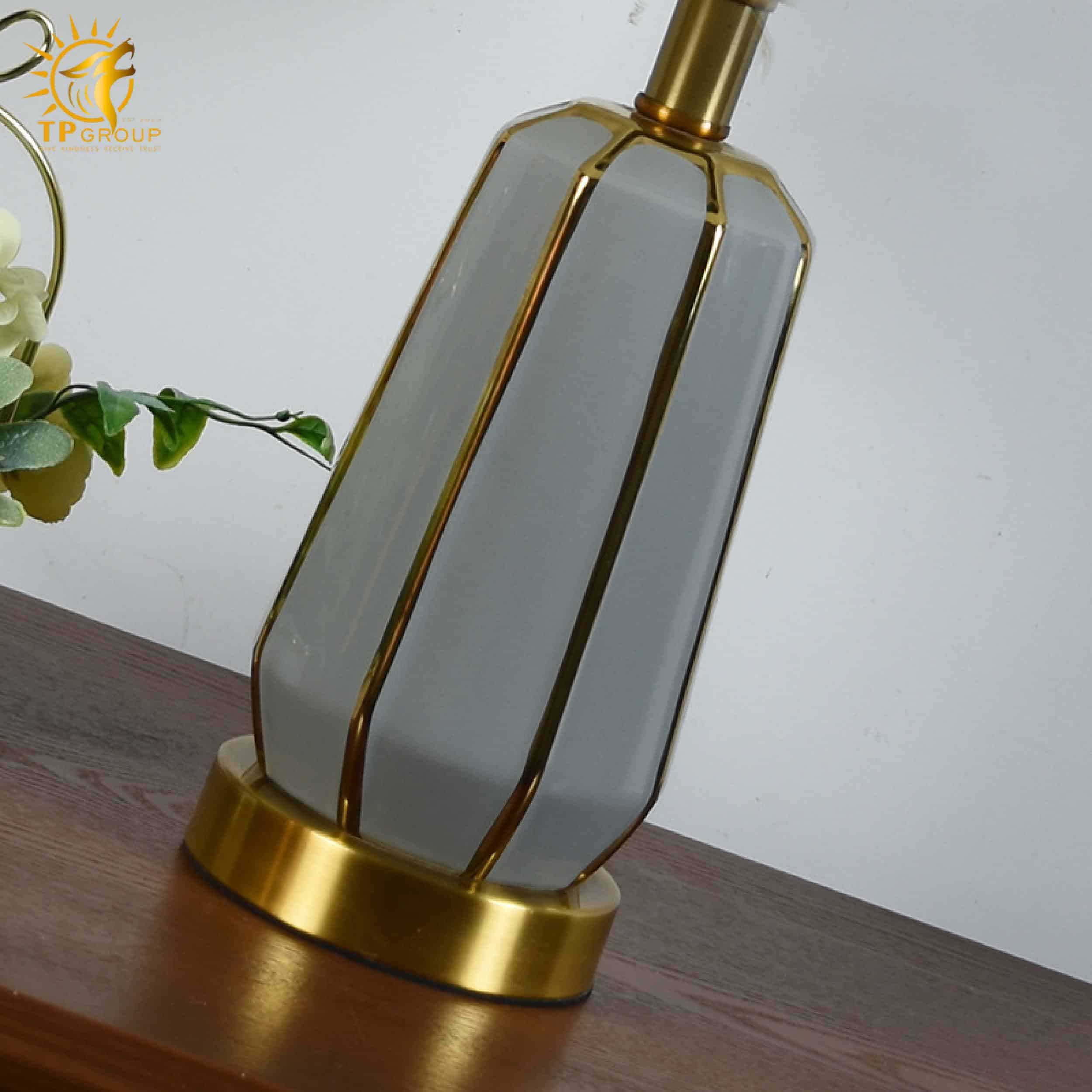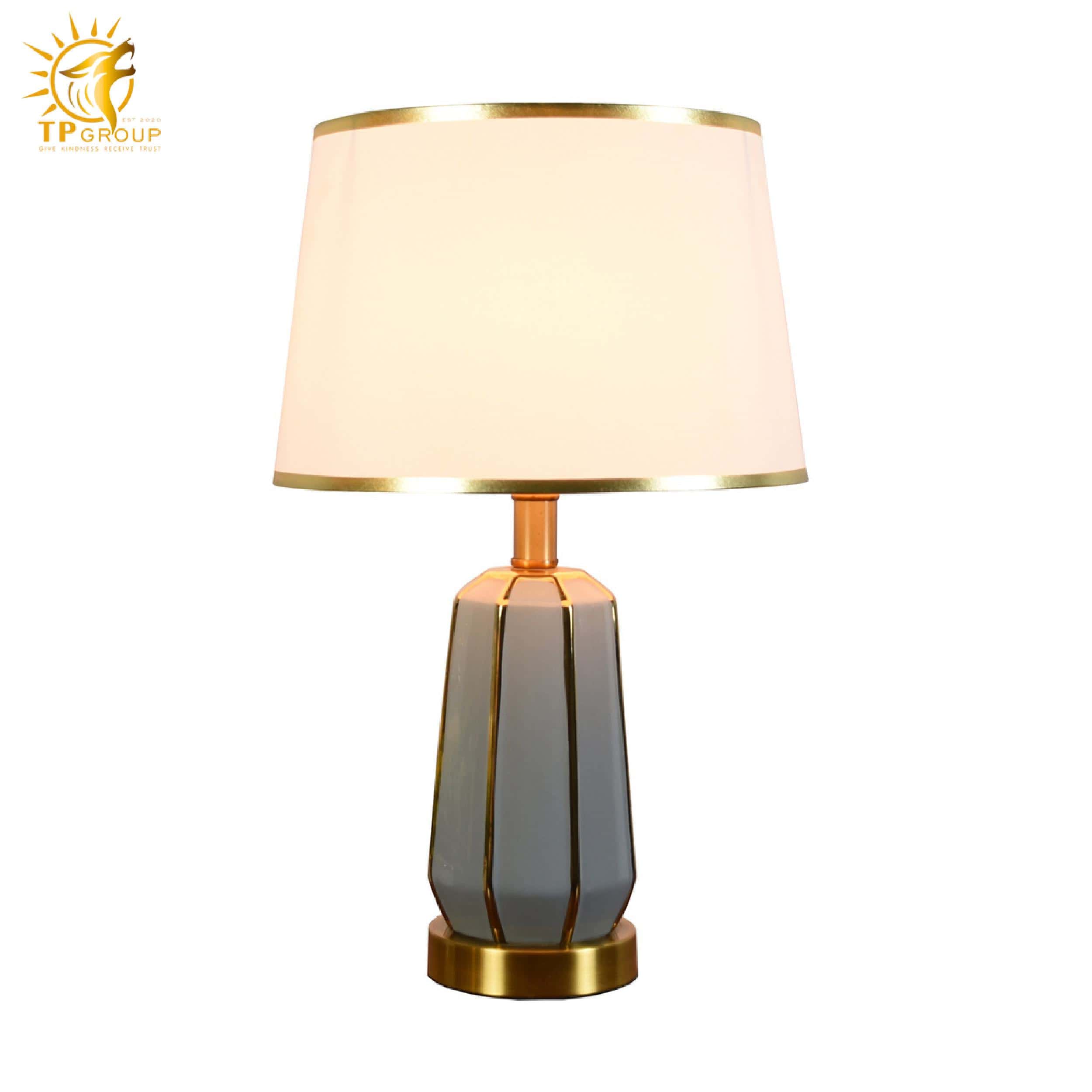 Đèn để bàn sở hữu thân đèn tạo hình khối chắc chắn, viền ánh kim nổi bật kết hợp cùng chụp đèn vải trắng viền vàng sang trọng. Từng chi tiết đều được trau chuốt tỉ mỉ, mang đến vẻ đẹp hài hòa giữa cổ điển và hiện đại.