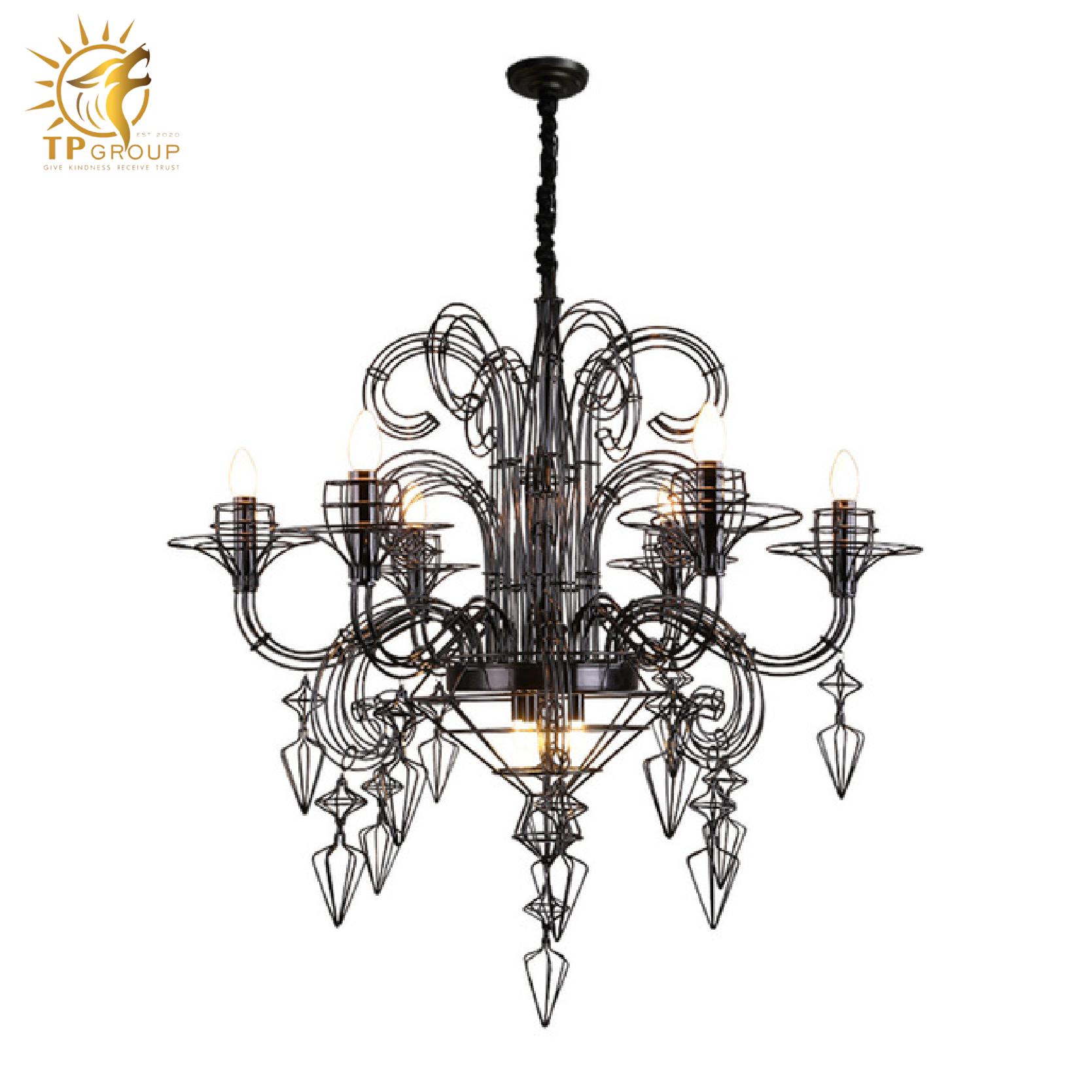 Khung đèn được tạo hình từ kim loại đen nghệ thuật, mang vẻ đẹp vừa mềm mại, bay bổng vừa mạnh mẽ, vững chãi. Các chi tiết giọt pha lê kim loại độc đáo, kết hợp ánh sáng ấm áp từ bóng nến, tạo nên hiệu ứng lung linh, huyền ảo cho không gian.
