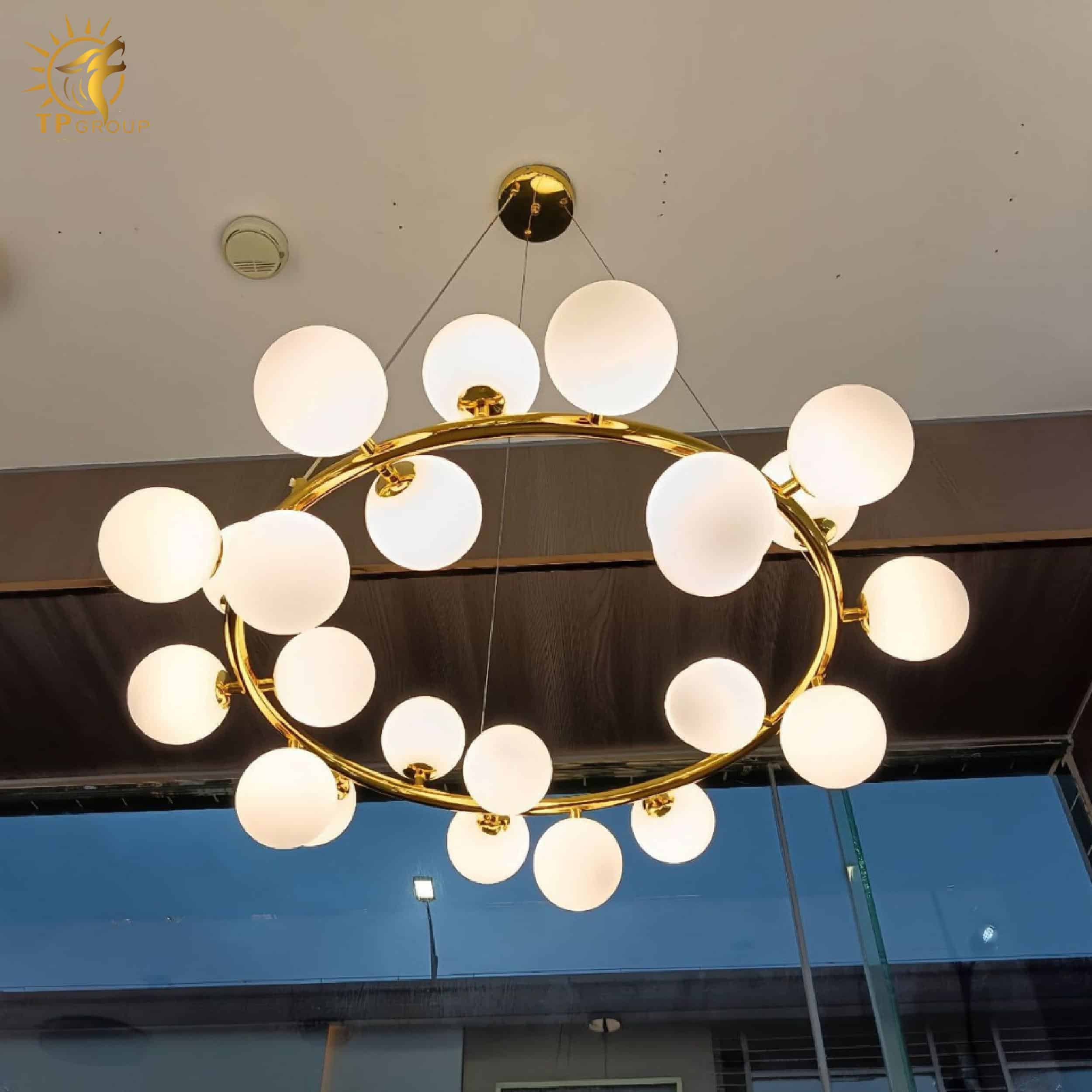 Lấy cảm hứng từ những đám mây bồng bềnh, các bóng đèn tròn trắng đục được sắp xếp xung quanh khung tròn kim loại mạ vàng sang trọng.