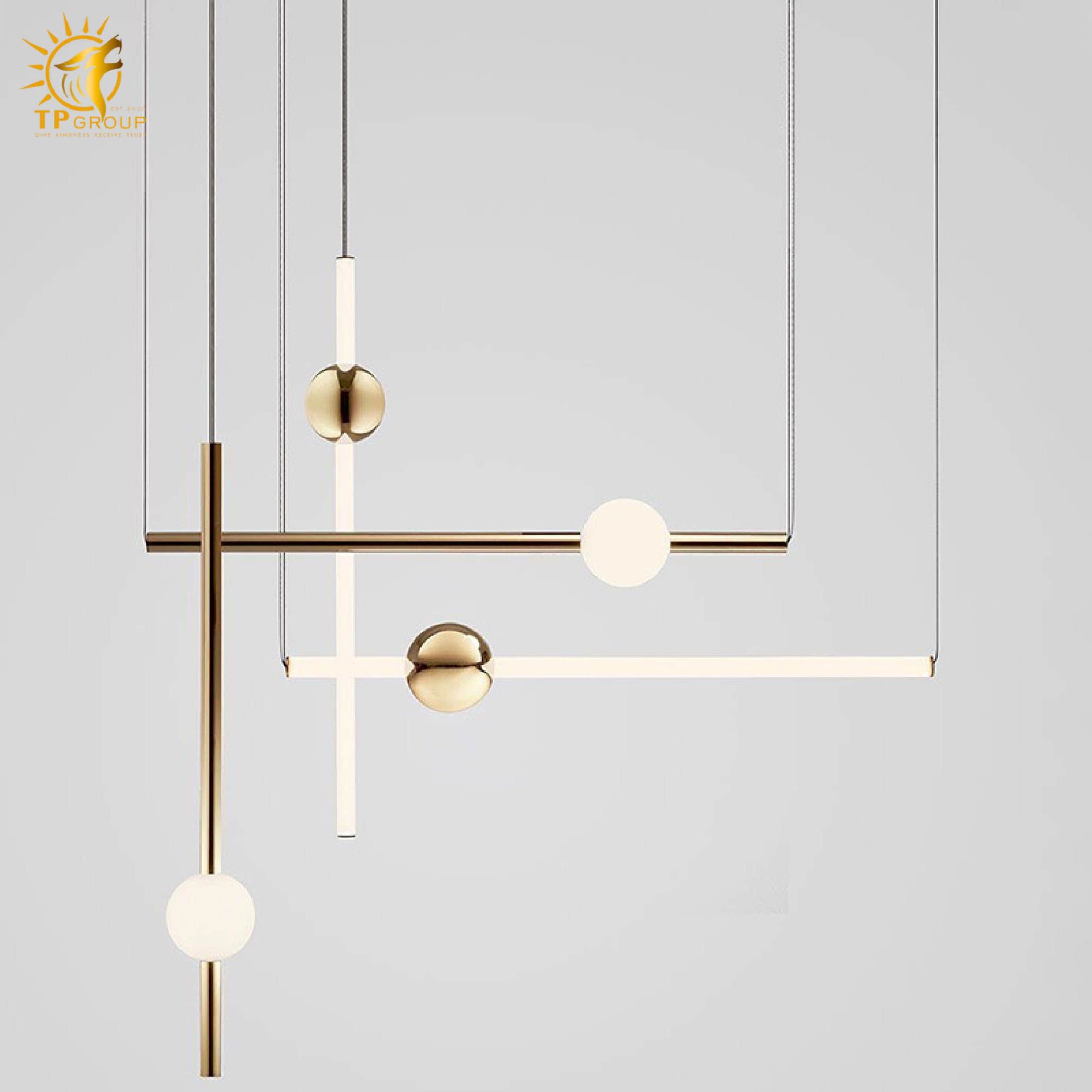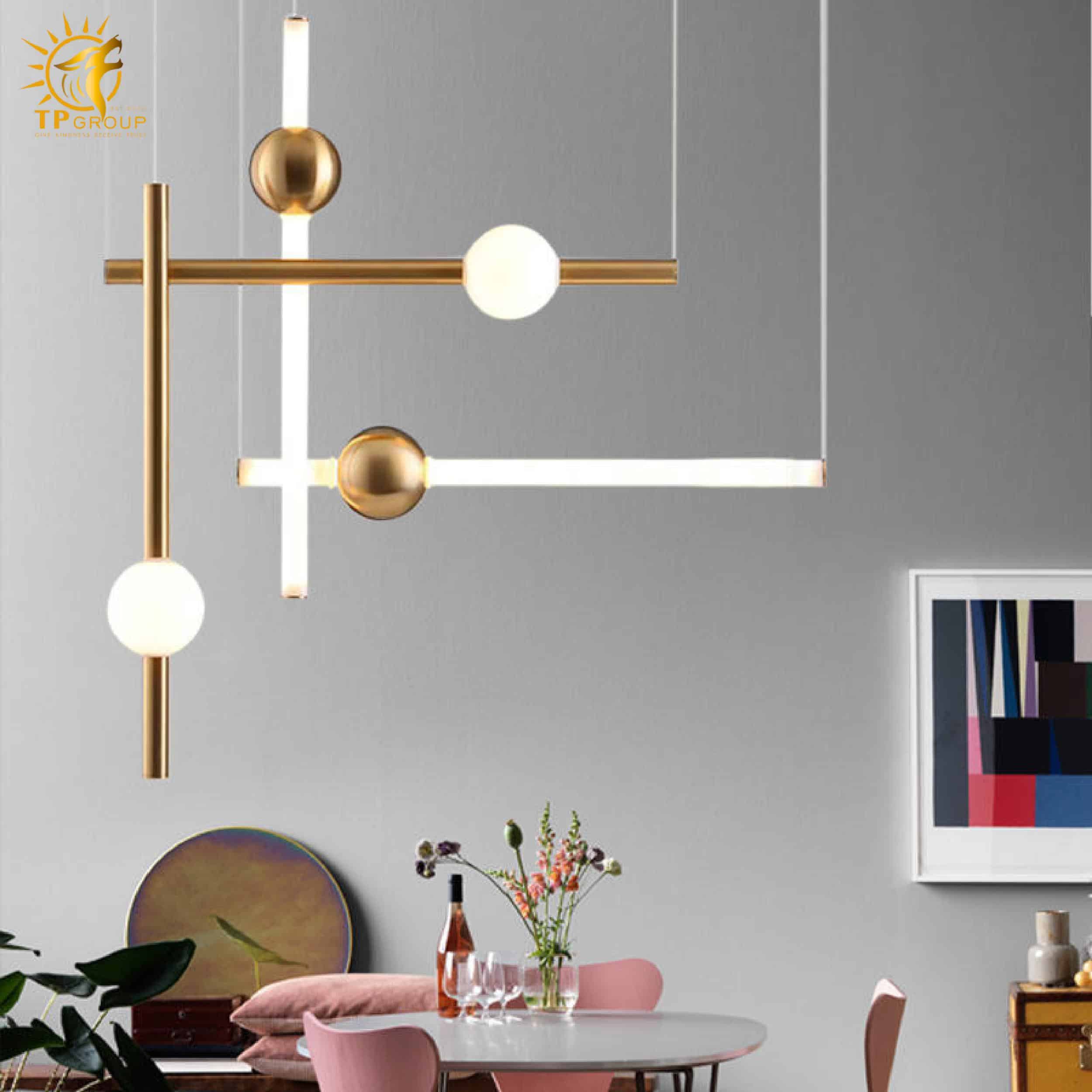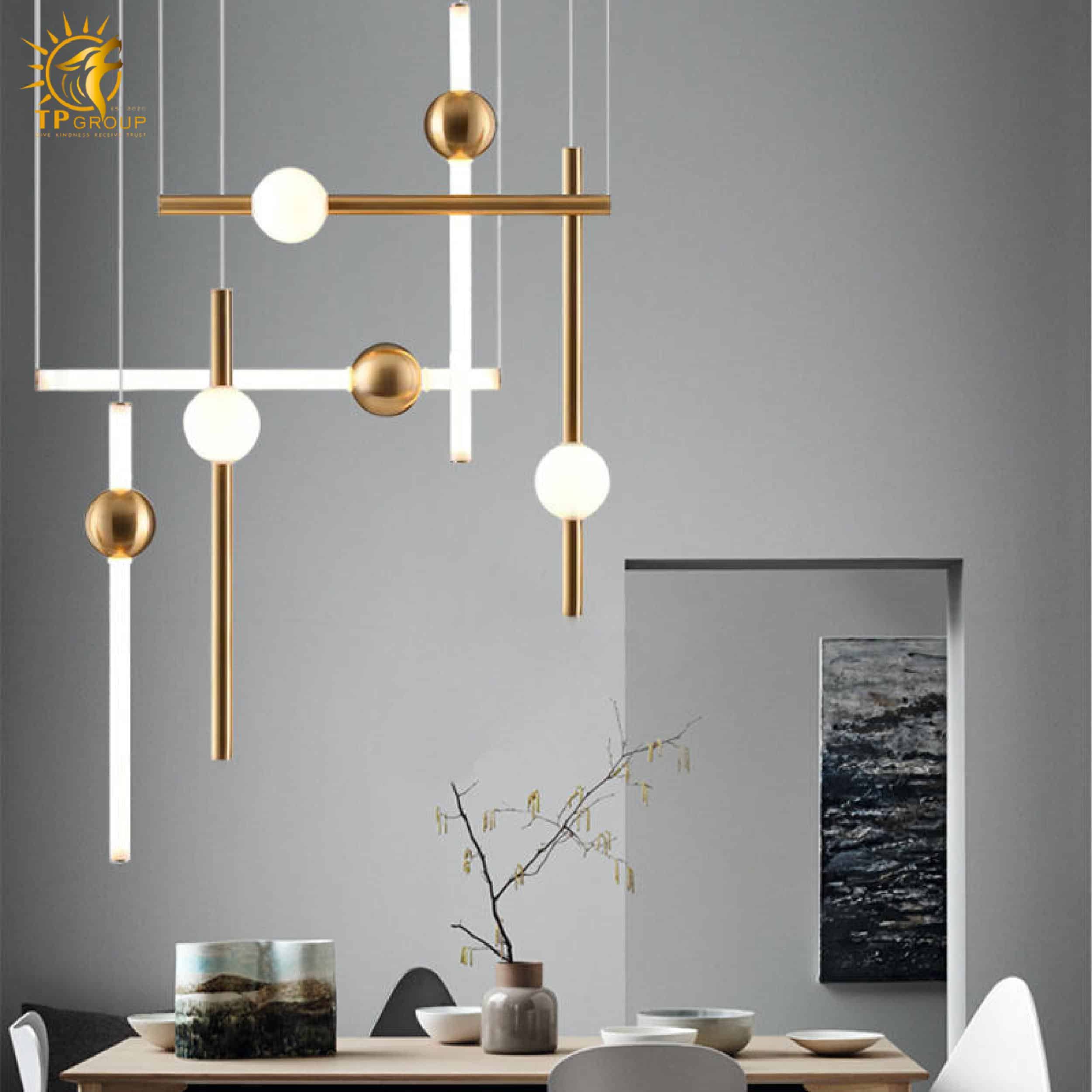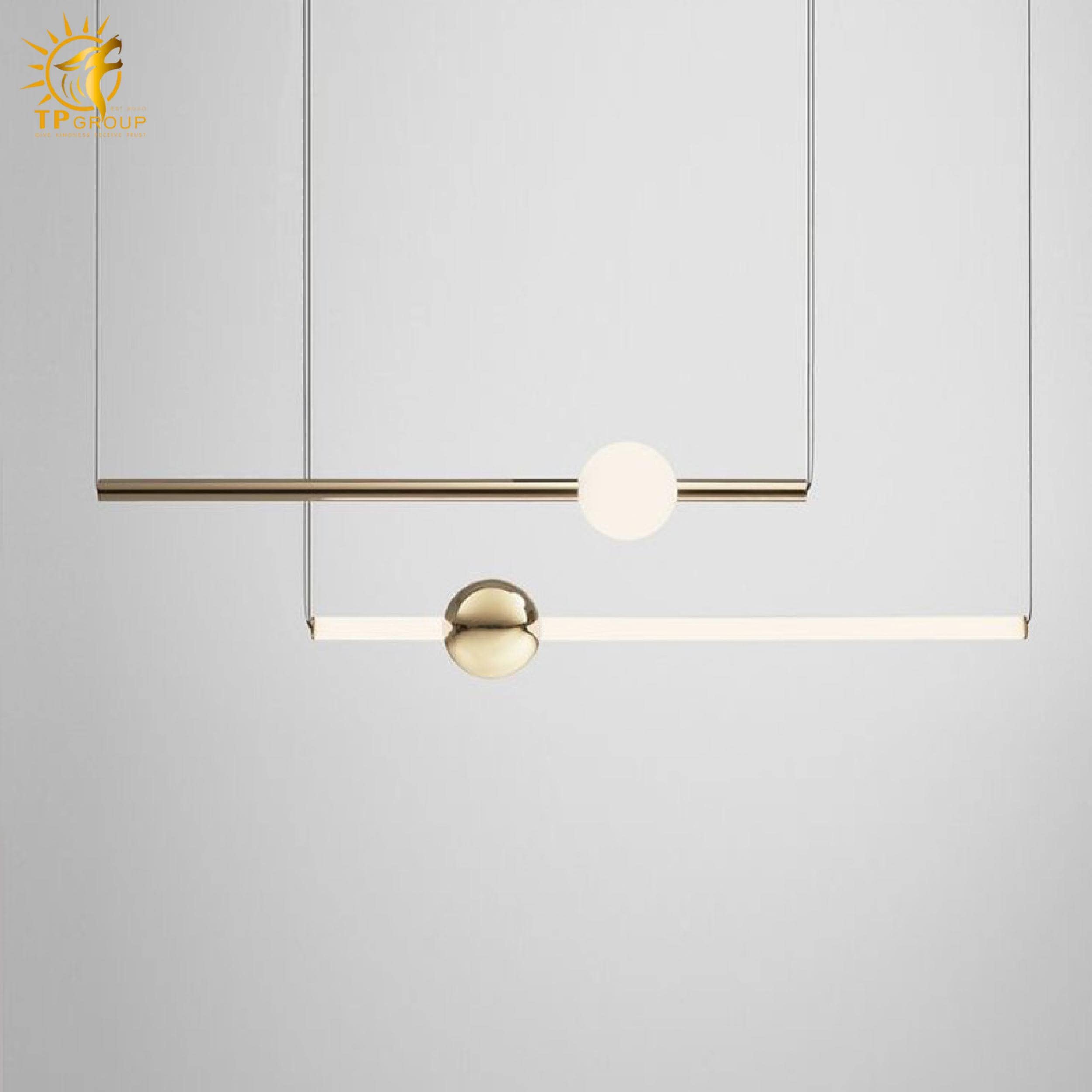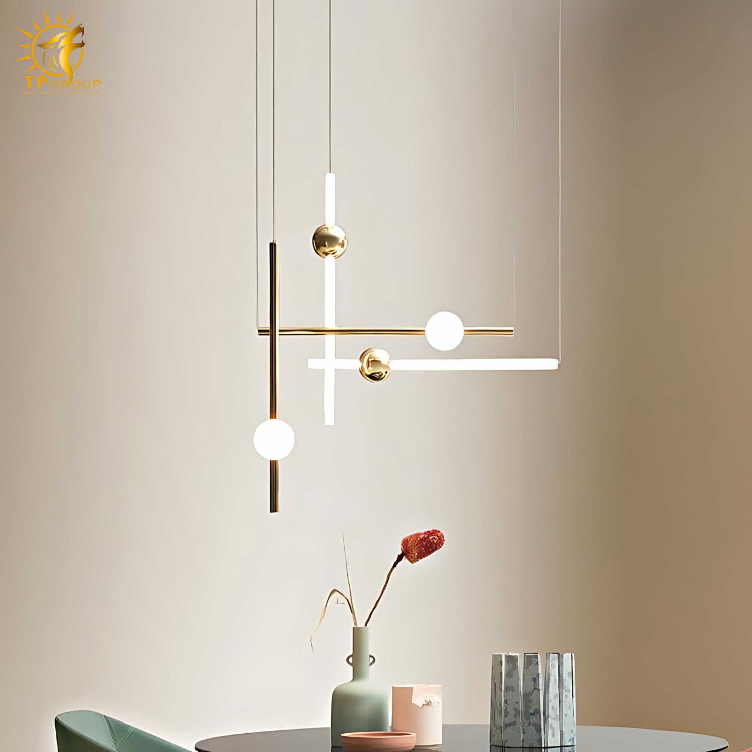Đèn thả hiện đại sở hữu kiểu dáng tối giản nhưng cực kỳ bắt mắt. Các thanh kim loại thanh thoát kết hợp cùng quả cầu ánh sáng tròn trịa, tạo nên một tổng thể hài hòa, mang đậm dấu ấn sáng tạo và phong cách thời thượng.