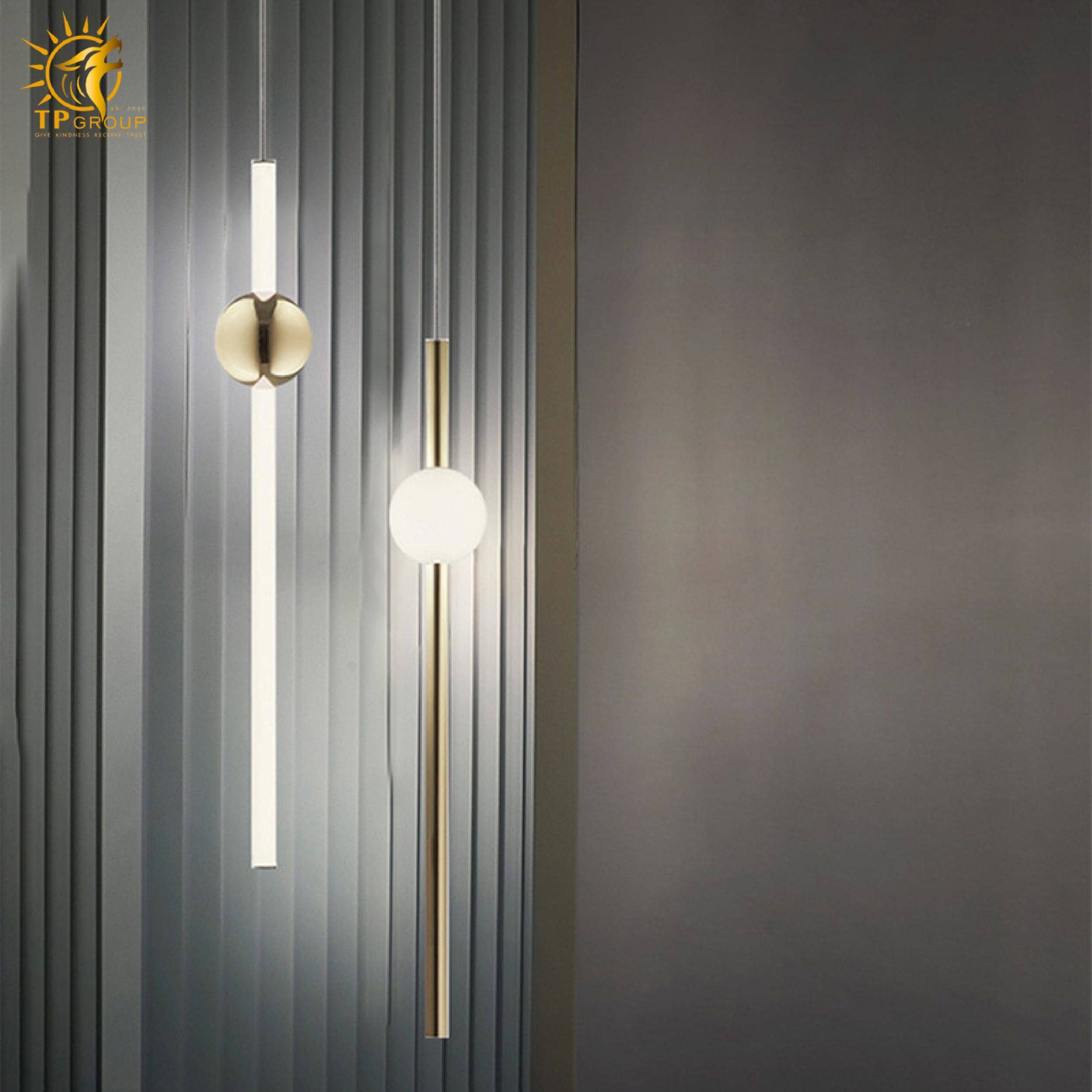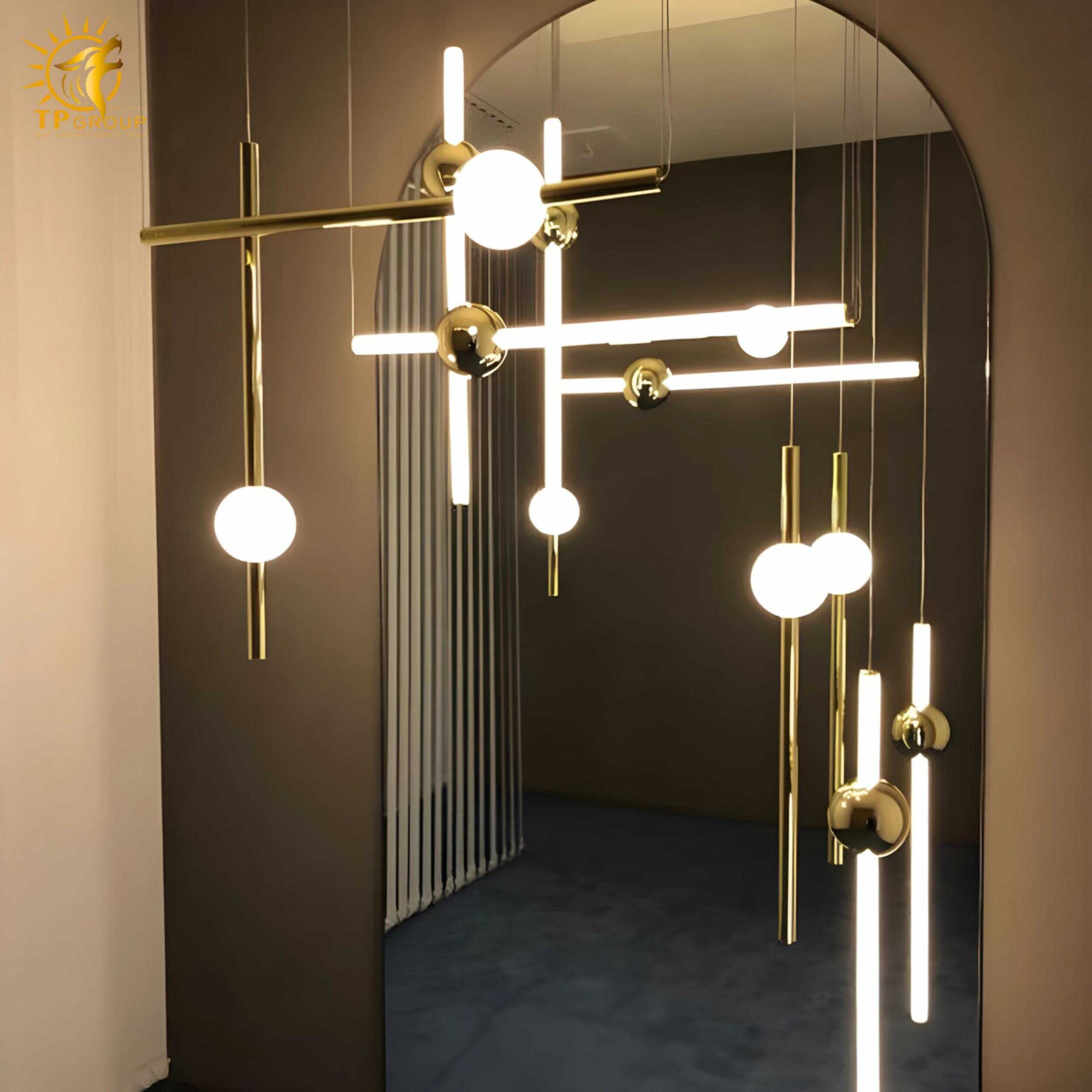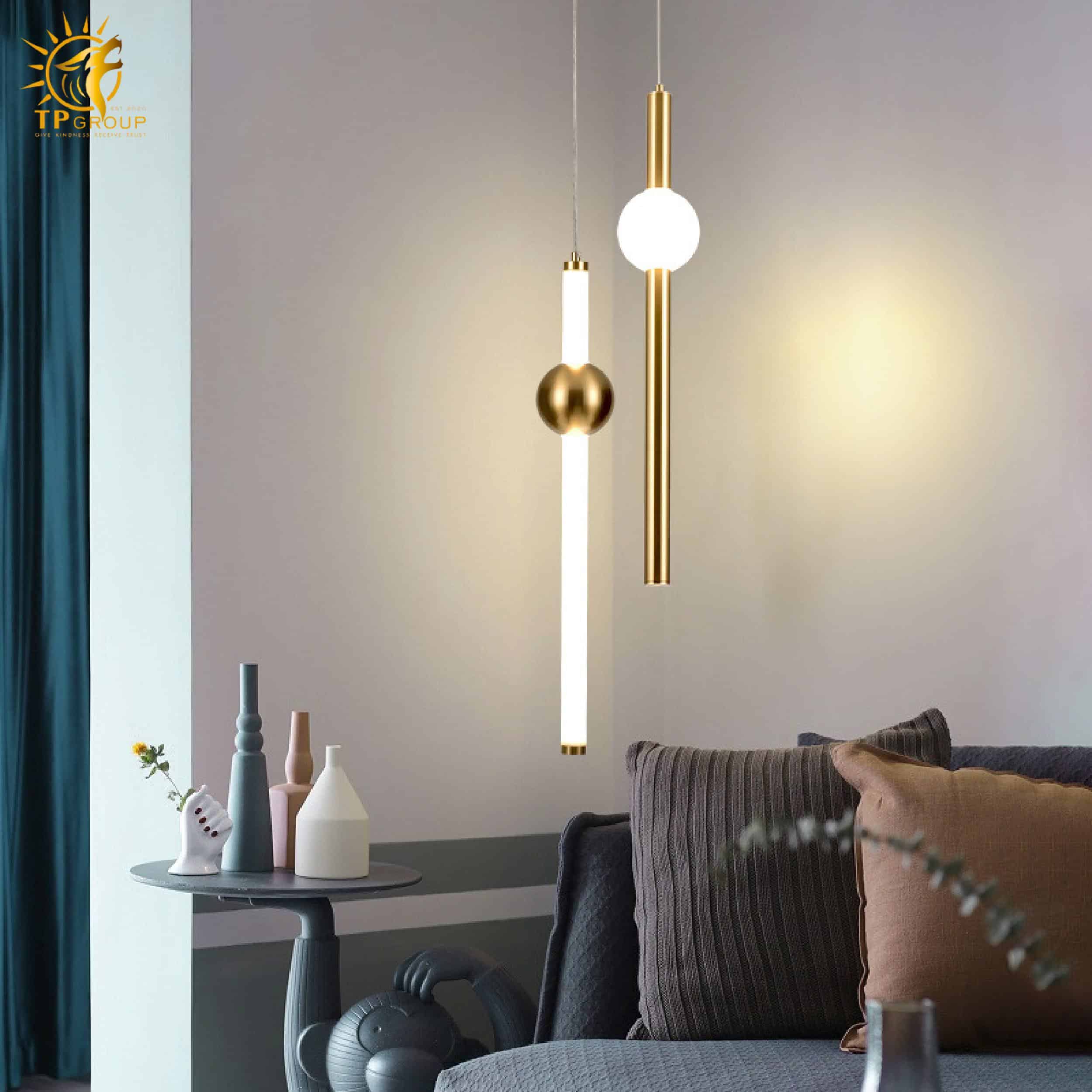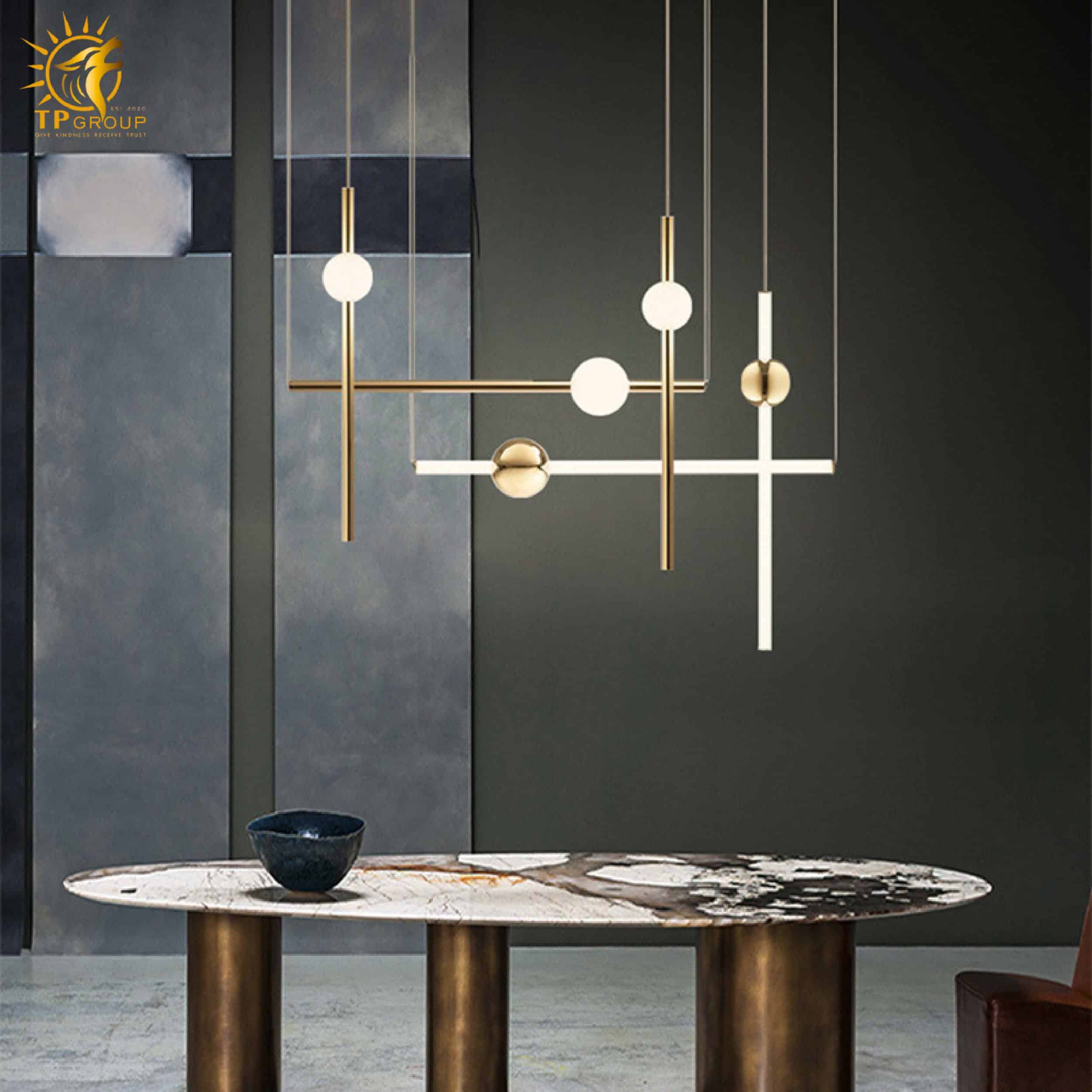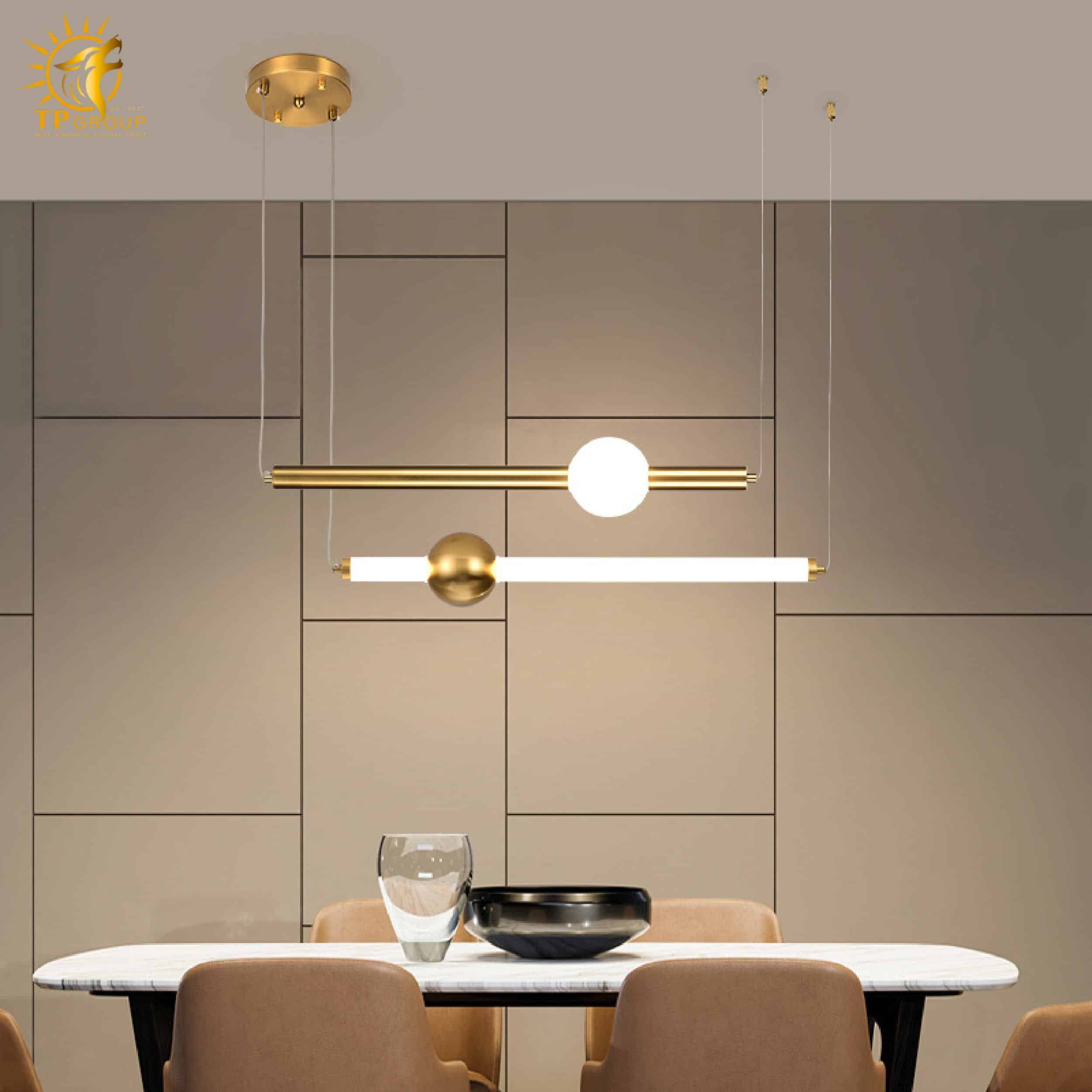 Đèn thả hiện đại sở hữu kiểu dáng tối giản nhưng cực kỳ bắt mắt. Các thanh kim loại thanh thoát kết hợp cùng quả cầu ánh sáng tròn trịa, tạo nên một tổng thể hài hòa, mang đậm dấu ấn sáng tạo và phong cách thời thượng.