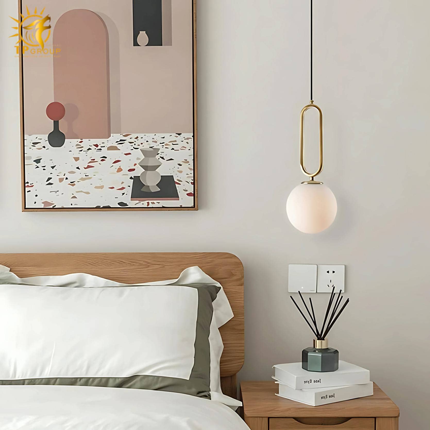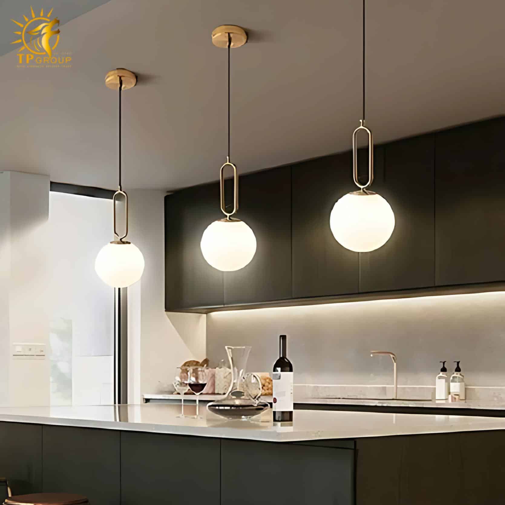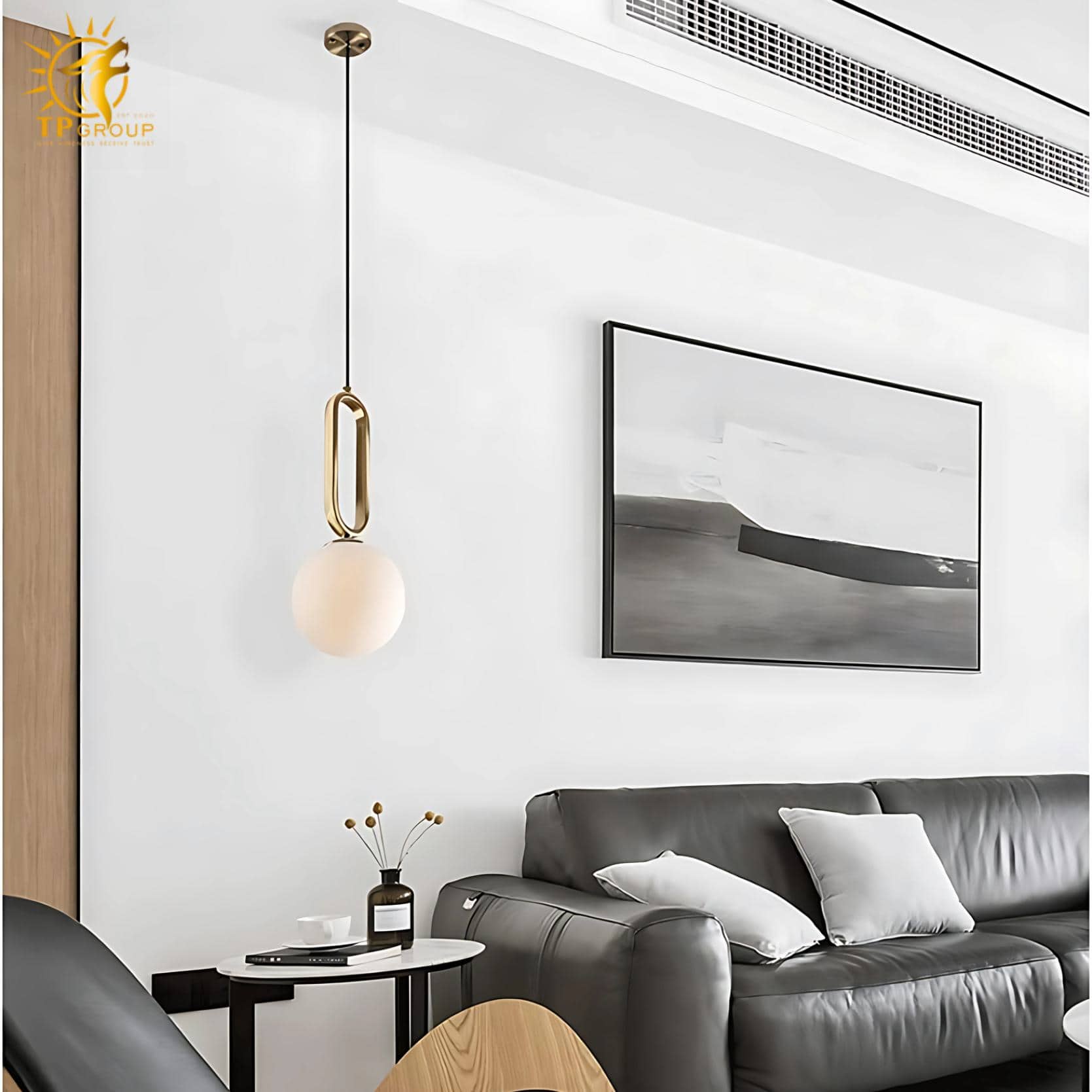 - Thiết kế hiện đại – tối giản: Khung kim loại sơn tĩnh điện kết hợp quả cầu thủy tinh trắng sữa, vừa tinh tế vừa sang trọng.